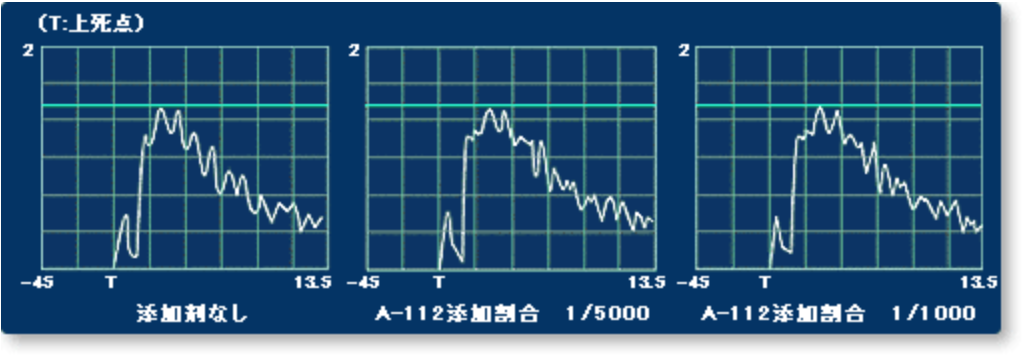 計測データを見ると、A-112SP添加剤注入後でも熱発生時のピーク値はほぼ変わらないか、やや低い事がわかります。